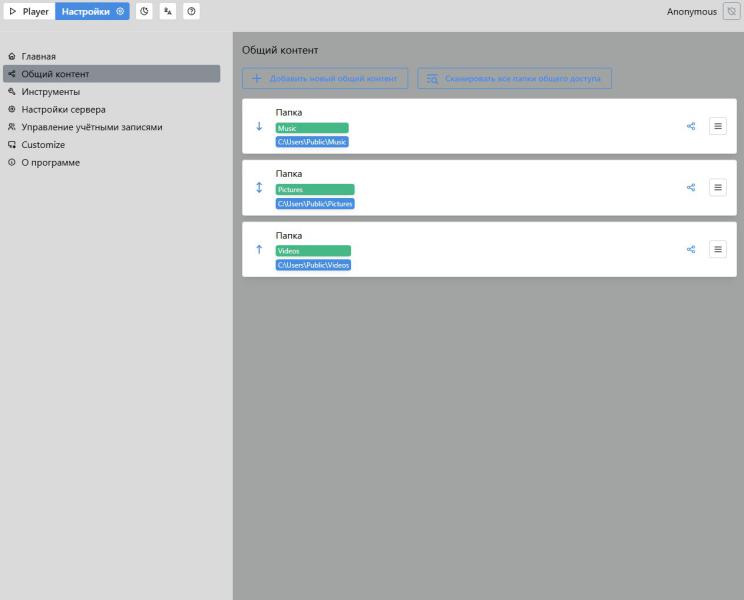 ● Управление через веб-интерфейс Доступ к медиаконтенту с любого браузера, возможность воспроизведения прямо в интерфейсе или отправки на совместимые устройства.
