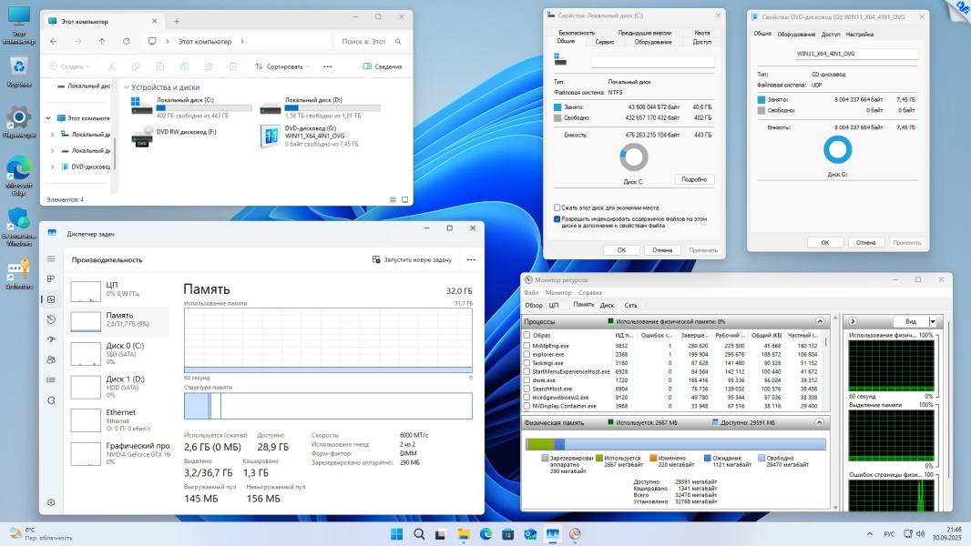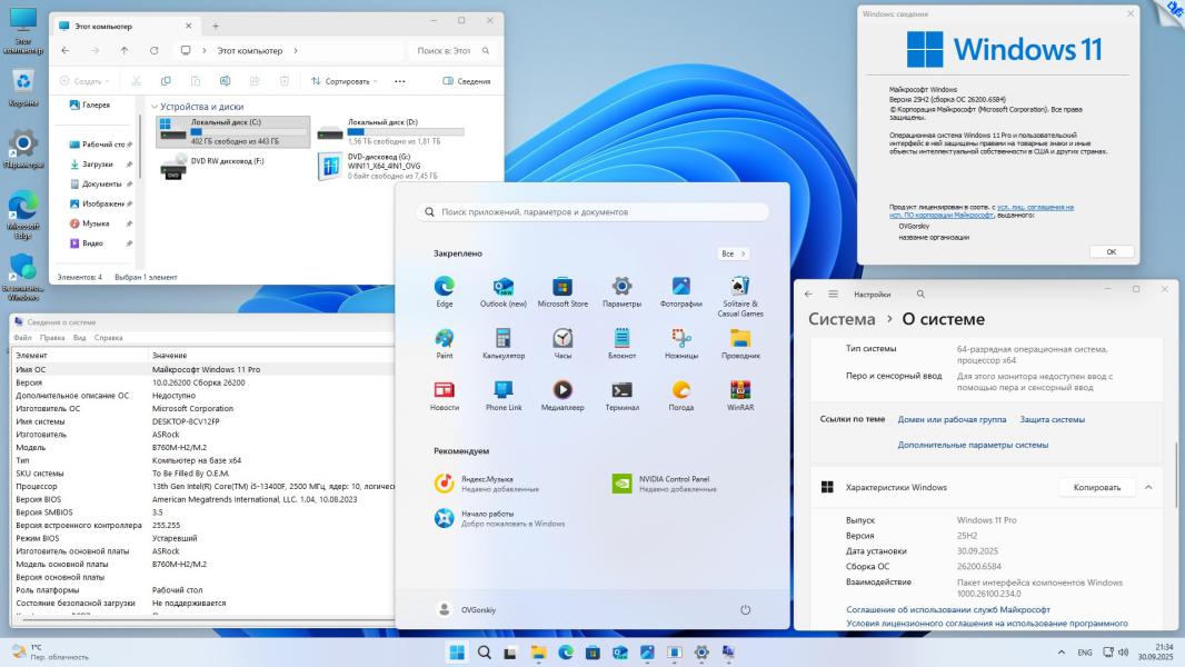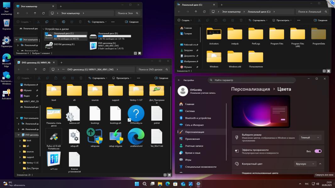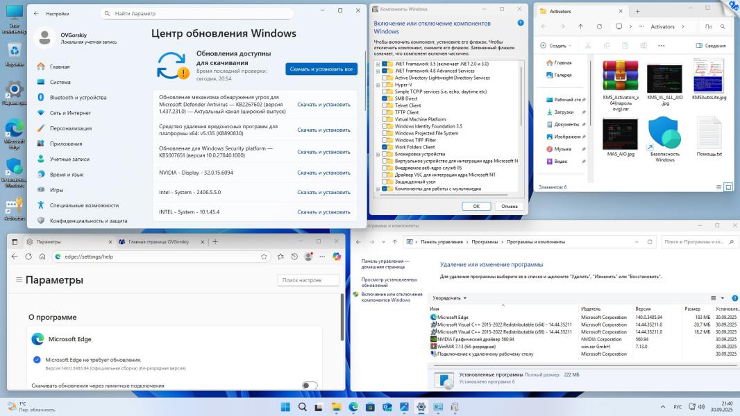 Внесённые изменения: ● Сняты проверки TPM 2.0, Secure Boot и поддерживаемых процессоров. ● Установка возможна даже без активного интернет-соединения. ● Интегрированы накопительные обновления по сентябрь 2025 года. ● Отключено автоприменение BitLocker. ● Включены старые и новые компоненты: .Net Framework 3.5, SMB 1.0. ● На рабочем столе отображается «Мой компьютер», видны скрытые файлы и расширения. ● В систему добавлены: WinRAR 7.13, Visual C++ 2015–2022, обновлённый Microsoft Edge.