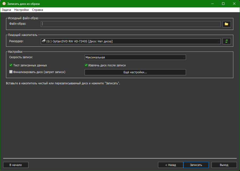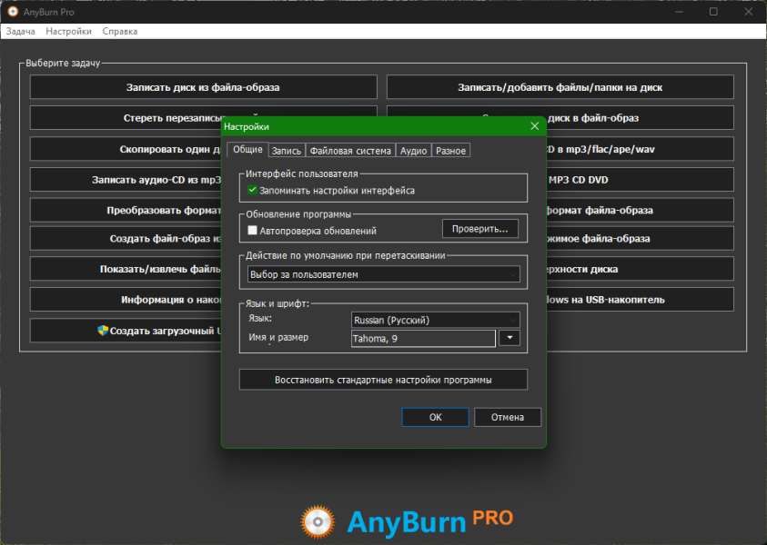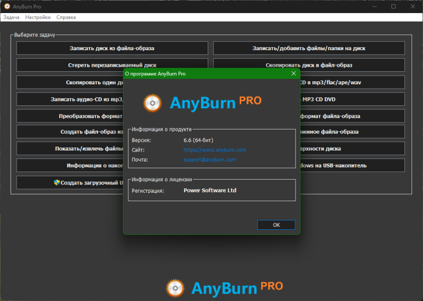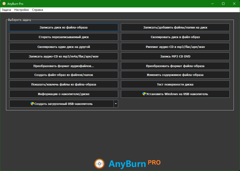 Any Burn — компактная и надёжная программа, предназначенная для всех видов операций с оптическими носителями: CD, DVD и Blu-ray. Её интерфейс прост и функционален: каждая задача имеет собственную вкладку, что делает работу интуитивно понятной даже для новичков. Приложение позволяет записывать как готовые образы, так и отдельные файлы или целые каталоги, создавать музыкальные диски Audio-CD, стирать RW-диски, а также конвертировать и копировать образы. Any Burn — это удобная альтернатива громоздким платным приложениям, обеспечивающая стабильную работу и высокую скорость записи.